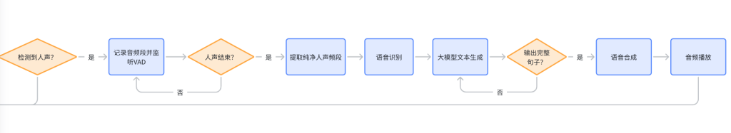 首先读取麦克风数据,然后VAD 采样分析并判断当前麦克风有没有人声输入(Voice activity detection,语音活性检测),如果检测到人声,就记录音频段并分析哪里是人声的开始和结束,提取出人声频段后,交给语音识别模型处理,并把文本提交给LLM(大模型)处理,根据提交的文本来生成回答的语句,如果检测到生成了完整的一句话,就把这句话扔给语音合成模型,得到音频数据,最后播放音频